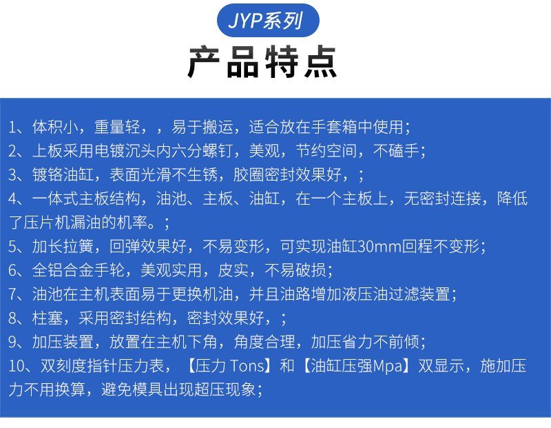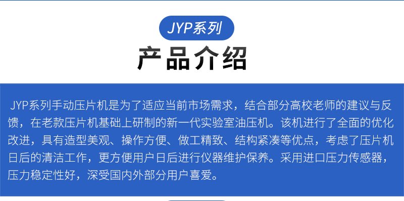 JYP系列手动压片机是为了适应当前市场需求,结合部分高校老师的建议与反馈,在老款压片机基础上研制的新一代实验室油压机。该机进行了全面的优化改进,具有造型美观、操作方便、做工精致、结构紧凑等优点,考虑了压片机日后的清洁工作,更方便用户日后进行仪器维护保养。采用进口压力传感器,压力稳定性好,深受国内外部分用户喜爱。