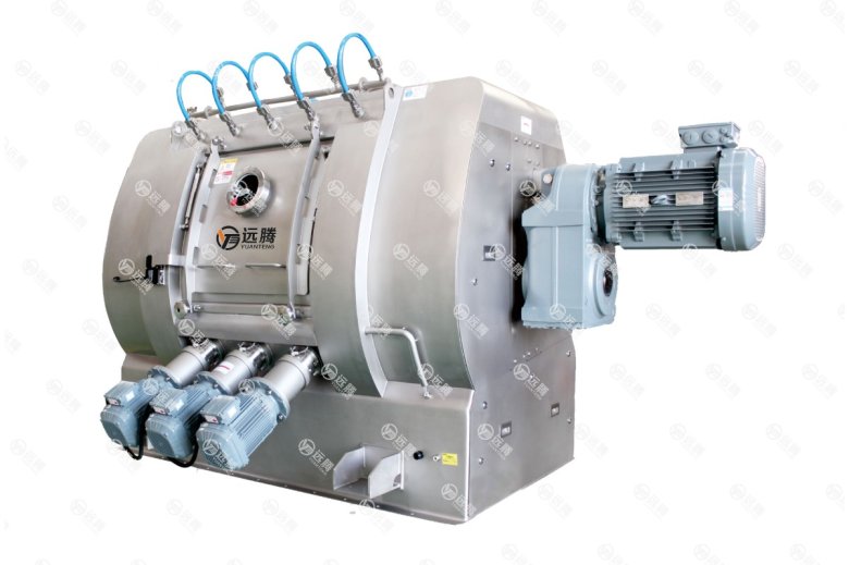 远腾的YDJH1500单轴双层高效混合机广泛适用于预混料、化工等行业中粉状、颗粒状、片状、块状、杂状及粘稠状物料的混合。概要说明与主要结构(1)概要说明该混合机转子上有内外两层桨叶(外层4个特殊角度的