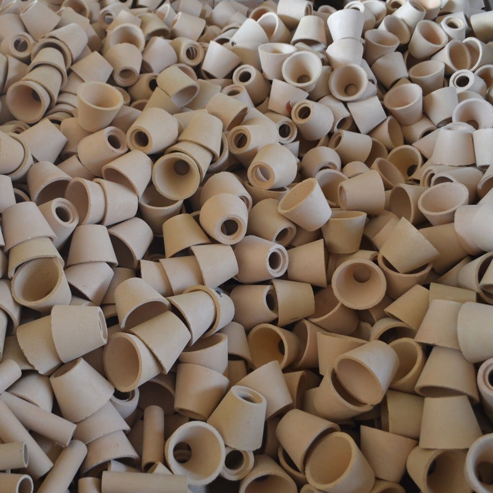 本消失模铸造用浇口杯采用了耐火度为1700℃~1750℃的耐火原料,采用机压成型技术,通过高温烧制而成,成品尺寸公差内孔、外圆、高度不超过图纸要求的1%。