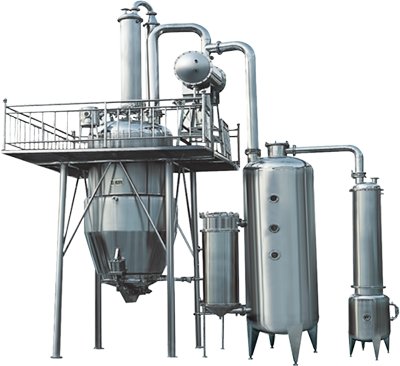 二次蒸汽继续上升,经冷凝器冷凝成热冷凝液,回落到提取罐内作新溶剂加到药面上,新溶剂由上而下高速通过药材层到提取罐底部,药材中的可溶性有效成份溶解于提取罐内溶剂。提取液经抽滤管抽入浓缩器、浓缩产生的二次蒸汽又送到提取罐作热源和新溶剂,这样形成的新溶剂大回流提取,故药材中溶质密度与溶剂中含溶质密度保持高梯度,药材中的溶质高速溶出,直至完全溶出(提取液无色),此时,提取液停止抽入浓缩器,浓缩的二次蒸汽转送冷却器,浓缩继续进行,直至浓缩成需要比重(1.2~1.34)的药膏,放出被用,提取罐内的无色液体,可放入贮罐作下批使用,药渣从出渣门排掉,若是用有机溶剂提取,则先加适量的水,开直通和夹套蒸汽,回收溶剂后,将渣排掉。