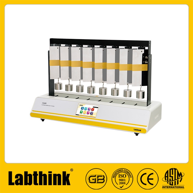 把贴有胶粘试样的试验板垂直吊挂在试验架上,下端悬挂规定重量的砝码,用一定时间后试样粘脱的位移量,或试样完全脱离的时间来表征胶粘试样抵抗拉脱的能力。