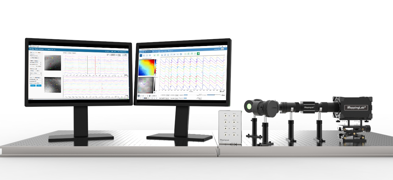本系统用于同步监测心脏或神经组织多点动作电位及钙瞬变信号。可同步检测32x32通道至128x128通道,分析所有通道的动作电位传导方向、传导速度、起搏点位置、动作电位时程、钙瞬变信息及动作电位与钙瞬变时间差等信息。