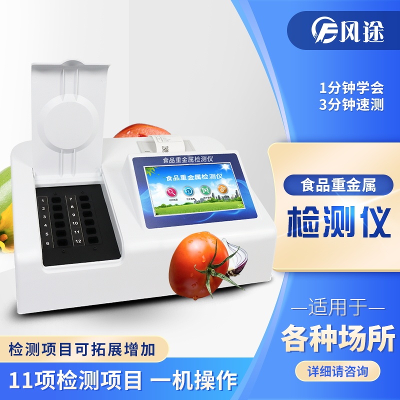 FT-ZJS01食品重金属快速测定仪可广泛应用于果品、蔬菜、水质、水产品中重金属铅、六价铬、汞、砷、铁、镍、铝的快速检测,检测项目可根据客户的需求定制。