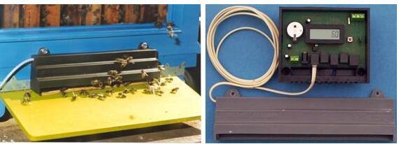 ·检测器模块:检测器具有防风雨保护壳,安装在蜂房入口。检测器有20个通道让蜜蜂通过,不会对蜜蜂的自由活动造成影响。每当一只蜜蜂进入或离开蜂房的时候,检测器就会产生一个电脉冲,传入控制器模块。检测器不能识别蜜蜂是进入蜂箱还是从蜂箱飞出,不能检测特别慢和特别快快的动作,能够自动补偿外部光源条件。对于很大的蜂群,可以将两个检测器模块同时安装在蜂房入口,连接到一个控制模块,因此蜜蜂能从40个通道进入蜂房。
