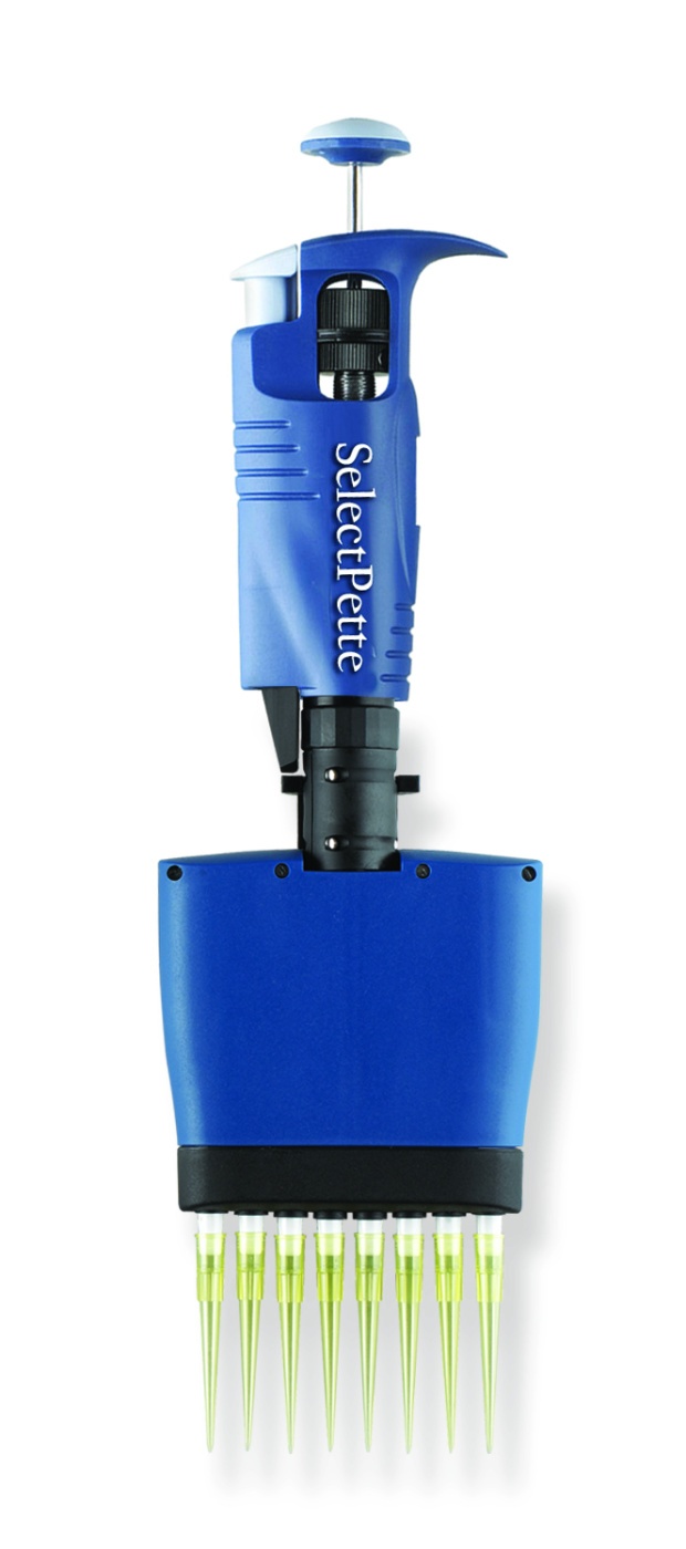 SelectPette™ 多道移液器有八道和十二道可选择,按照SelectPette™单道移液器风格而成,可舒服地握在手中,每个移液器的量程都是独立的,可靠的活塞确保证移液器不同量程上的准确性和可重复性。量程均可以在黑色大拇指轮盘或顶部的旋钮上以作调节。
