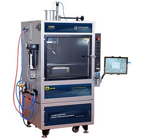 产品简介:MSK-TH-04FA火焰辅助喷雾热解涂覆机,喷胶机是为研究金属合金、陶瓷表面质量改进而研发的。在加热的基底上喷涂雾化的溶液,从而获得沉积薄膜,即在基底表面形成一种化合物组成结构。而喷雾在沉积到基底之前,被氧化液化气混合物产生的火焰进行了加热。这种通过液化气火焰在加热的基底上喷雾的技术,在沉积温度下除了所需要的化合物被沉积,其他化学反应的产物都是易挥发的。因此,一般用于在金属和陶瓷基底上沉积氧化物,特别适用于Al2O3、ZnO的沉积,以及ZnO-MgO和ZrO2-Y2O3的亚稳态固溶体在非晶硅或镍基高温合金上的沉积。喷雾在容积泵和压缩空气的作用下经过预燃室和喷头。基底放置于加热台上,并通过专用的控制器设置加热温度。加热台安置于XY移动平台上,在涂覆过程中可以按设定的轨迹移动,以获得均匀的涂层。喷雾流率和基底运动轨迹可通过个人电脑控制,火焰的启动和强度也都是可控的。在无火焰情况下,喷雾可在压缩空气的带动下一样用于喷雾热解。因此可在同一基底上依次进行有火焰辅助、无火焰辅助的热解涂覆组合。