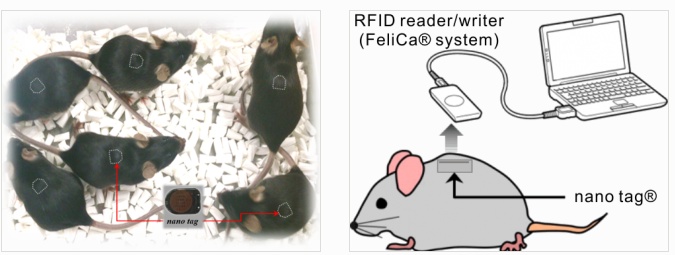 FeliCa®通信:电脑通过FeliCa®通信方法读取存储在nanotag里面的数据,只是同RFID读卡器轻轻接触一下nanotag,就可以开始或终止记录数据。当nanotag植入在动物里面,说记录的数据,就可以读取。
