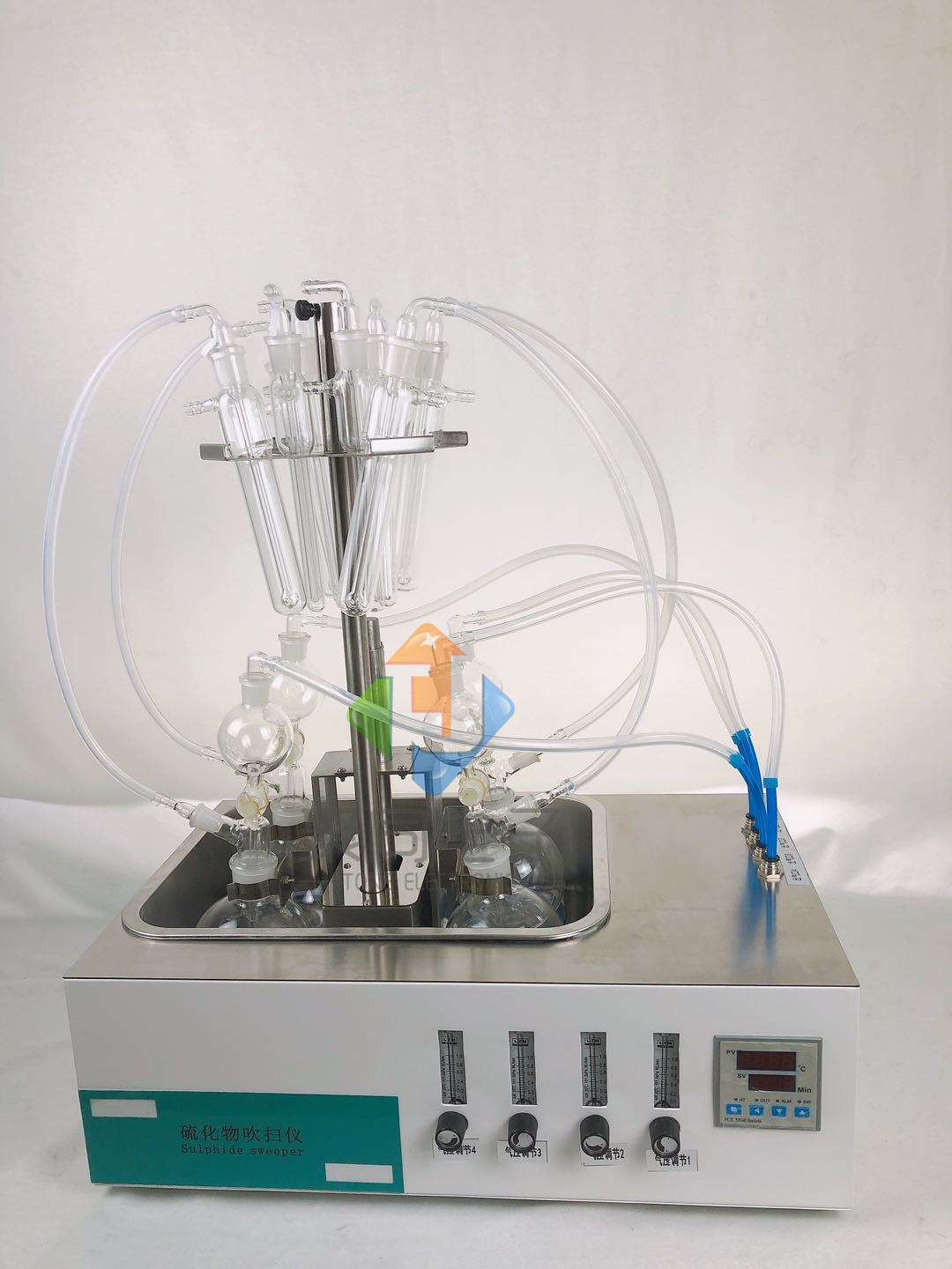 水质硫化物酸化吹气仪适用于地面水、地下水、生活污水和工业废水中硫化物的测定,按照国标《GB/T16489-1996水质硫化物的测定--亚甲基蓝分光光度法》以及《HJ/T60-2000水质硫化物的测定碘量法》的要求设计的,完全可以满足实验前处理要求,该仪器具有操作简单、样品均一性高、大大降低有害气体的损伤、处理样品量大等特点