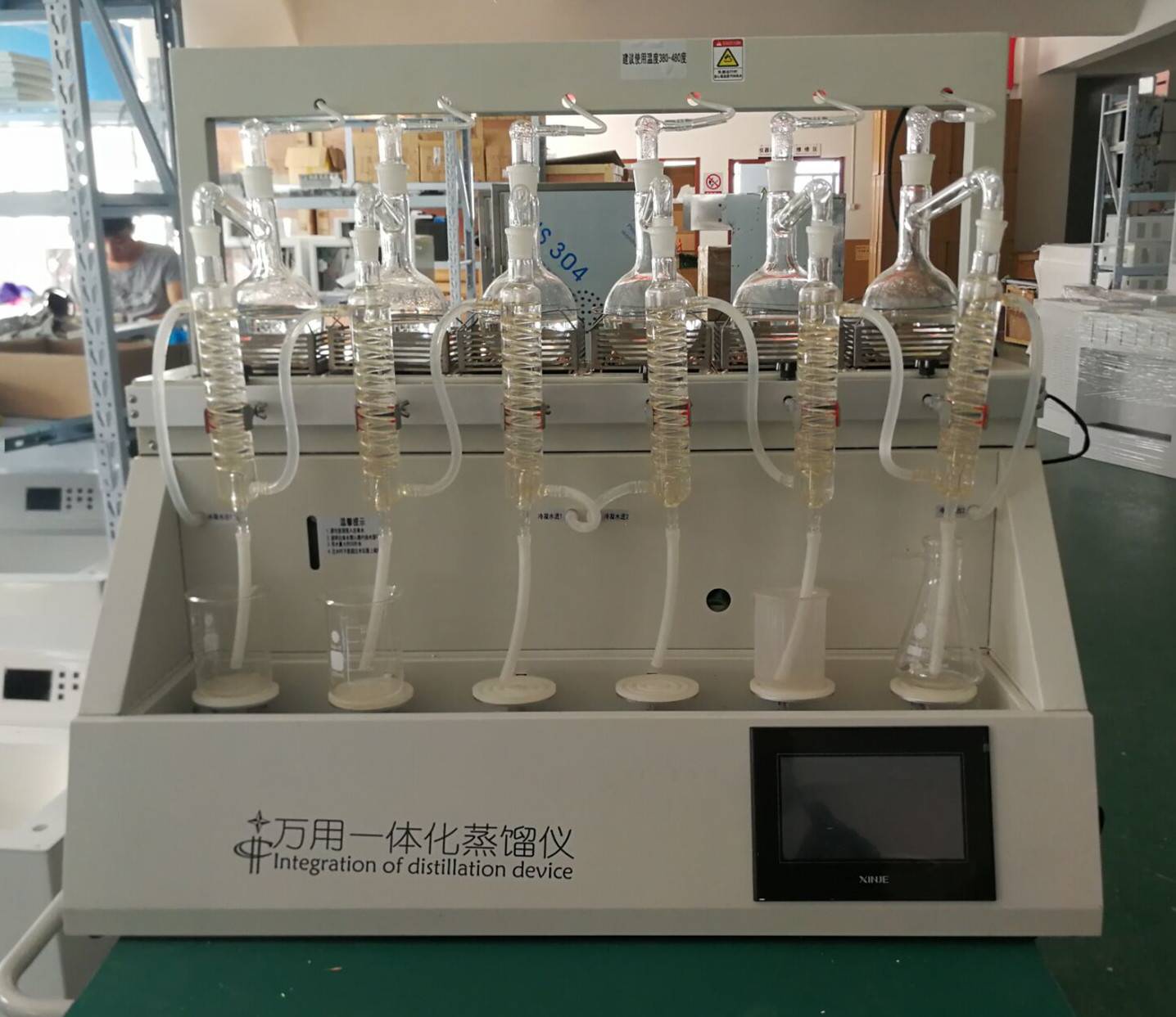 智能一体化蒸馏仪(全自动一体化万用蒸馏仪)是根据实验室蒸馏预处理操作规程,集恒温加热、蒸馏终点自动控制、冷却水循环于一体的新型智能蒸馏处理装置。该仪器实现了精密控温、自动防倒吸、加热均匀、防暴沸、智能终点控制等功能。使用方便,节能环保。经过计量认证实验室蒸馏回收率比对验证,结果准确可靠,回收率达95%以上。可广泛适用于环境监测、供排水、疾病预防控制中心等领域的水样的挥发酚、氰化、氨氮等的蒸馏操作;食品检测领域中的二氧化硫残留量以及甲醛、酒精度等的蒸馏操作。适用于环保、疾控、水产、供排水、高校、科研院所、厂矿企业等各类化学实验室需要蒸馏处理的场所,如挥发酚、lu化物、氨氮、凯氏氮、油中水分等项目的蒸馏处理及食品中二氧化硫残留的蒸馏实验。接收瓶不受限制。