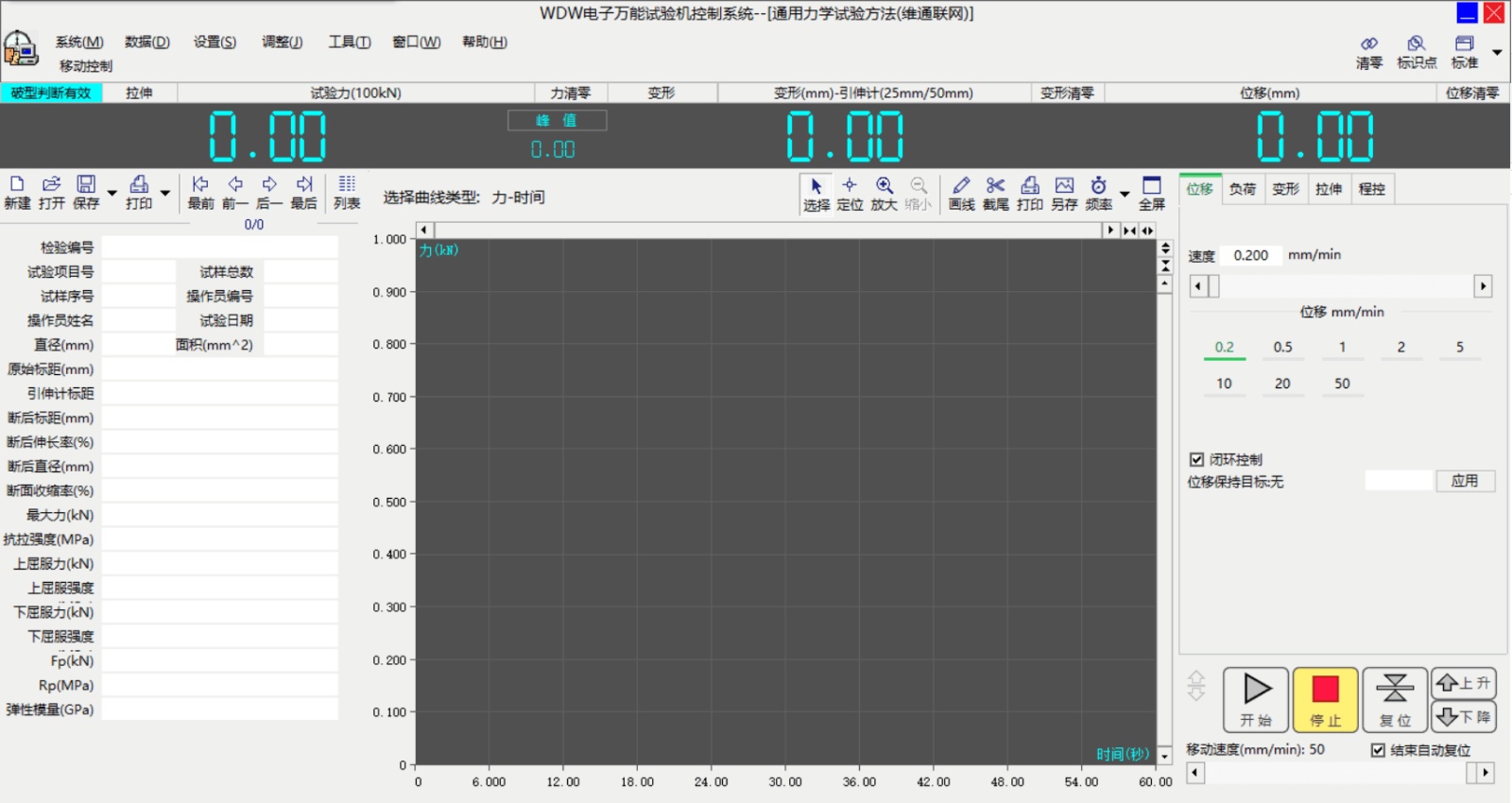 3、实时记录试验曲线,并可随时切换观察力-时间、变形-时间、力-变形和力-位移等试验曲线