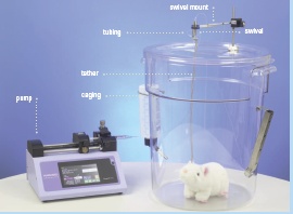 Rat infusion is the most common application for Instech's equipment. A basic system includes a swivel, a tether, catheter and tubing, a swivel mount and an infusion pump. In this example we have featured our easy-to-use Vascular Access Harness™ and tether kit, counter-balanced lever arm, jugular vein catheter and the Harvard Apparatus Pump 11 Elite.