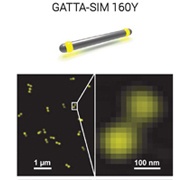 GATTA-SIM系列的纳米标尺可以用于检测您的SIM系统的分辨率。该纳米标尺带有两个荧光标记,这些荧光标记都是来自于密集排列的高量子效率的染料分子。两个荧光标记之间的距离固定,尺寸包括120nm,140nm和160nm。我们为您提供带有以下颜色的不同尺寸的纳米标尺,包括:红色(ATTO 647N),黄色(Alexa Fluor 568)或蓝色(Alexa Fluor 488)。