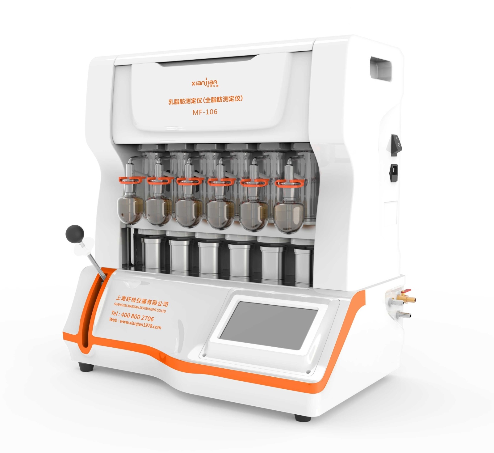 MF106全脂肪测定仪专注于测试乳制品、肉制品等普通索式抽提无法完成的样品的脂肪含量。在近30年的仪器制造经验的基础上,通过对本公司脂肪测定仪的综合考量,以及国标对脂肪测量的多种要求,本公司设计了独特的冷凝管,以完善的智能操作系统,攻克了油脂分层,溶剂回流等多方面技术难关,成功研发了MF-106全脂肪测定仪。