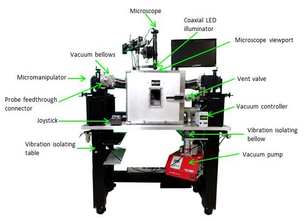 全自动真空探针台由美国MicroXact公司生产,该探针台通过真空系统、气体压力系统及自动化软件实现对系统真空腔内真空度的精确控制,通过光学显微镜及搭配的数字成像系统实现对测试晶圆影像的捕捉及存储,并通过软件控制自动马达根据设定程序实现晶圆测试过程中的自动对准及移动测试功能。同时配置的变温载物台通过加热和冷却装置实现样品的变温测试目的。
