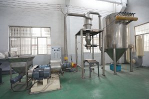 物料研磨后,风机将风吹入主机壳内,吹起粉末,经置于研磨室上方的分析器进行分选,细度过粗的物料又落入研磨室重磨,细度合乎规格的随风流进入旋风收集器,收集后经出粉口排出,即为成品。风流由大旋风收集器上端的回风管回入风机,风路是循环的,并且在负压状态下流动,循环风路的风量增加部分经风机与主机中间的废气管道排出,进入小旋风收集器,进行净化处理
