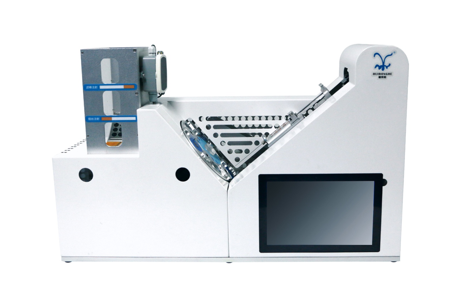 本产品主要适用于各烟草研究机构,给香烟注射香精香料来改变香烟或滤嘴品味以及开展香烟添加香精香料生物安全评价工作的实验。产品采用智能化、模块化与轻量化设计,结构紧凑精巧,能够完成香烟自动分拣、香烟自动装载、香烟自转动、香烟自动卸载、香精香料自动补液、自动注射等功能,同时,创新增加注射器剩余香料智能识别,自动化程度更高。功能模块自由更换以适应不同长度、直径的香烟类型,涵盖市面上包括电子烟在内绝大部分卷烟产品。产品具有历史数据查询、打印导出功能,并能自动提示仪器当前运行状态、操作状态、错误信息,此外,产品能自动测量与记录实验的温度湿度。