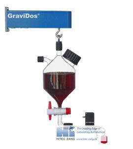 GraviDos液体滴加系统包含一个挂在称量系统上的玻璃容器,重量变化被实时记录,流量依据重量信号通过电磁阀来调节。这种控制是一种正确的方式,既无需按照不同介质来校准,也不用担心气泡的影响。称量系统从1Kg到15Kg可供选择,玻璃储存容器从500ml到2000ml,超过的可以定制。