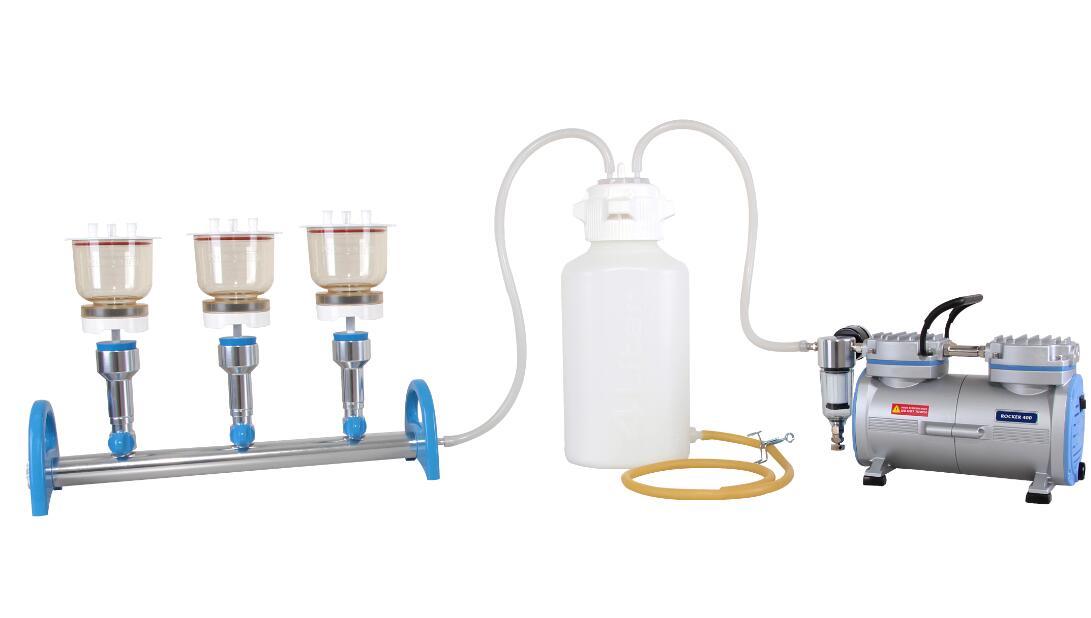 MultiVac 310-MS-T * Rocker 400 无油式真空帮浦 * MF 3, 300ml 磁式过滤漏斗含盖子 * 4000ml PP 废液瓶 (含排水装置) * 高压硅胶管 (1m x 2 pcs) | 大量样品过滤BioVac 330B * Rocker 400 无油式真空帮浦 * BioVac 331 3孔不锈钢过滤组合 * 4000ml PP 废液瓶含排水装置 * Dragon 100 电子点火本生灯 * Pall GN-6 MCE 滤膜 (0.45μm) * 高压硅胶管 (1m) x 2 |