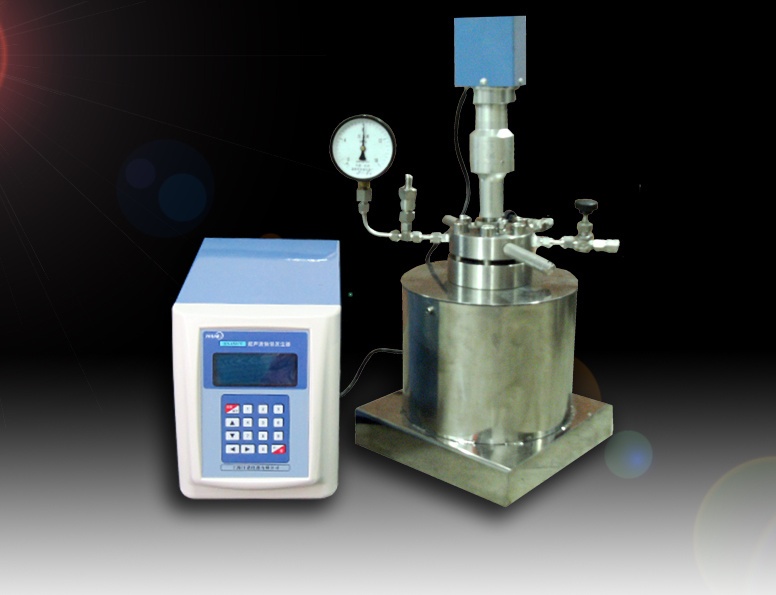超声波信号发生器、搅拌、恒温装置、不锈钢耐压釜体和聚能式超声波换能器+钛合金变幅杆组成,超声波换能器通过专用法兰固定于釜体上,确保气压不泄露,釜体可做成双层或3层用来加温或降温,顶部可安装专用磁力耦合调速电机确保釜内无死角.可设计加料、放料、回流等装置。釜盖可选配机械升降装置.
