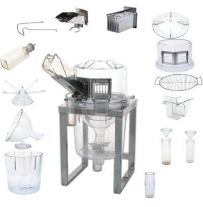 第六步:将下面的笼格附着在上面的笼格上,并用上面笼格的三个外形像槽口的三个肋骨排列在下面凹槽,使其上升并保证下面笼格安全地进行是顺时针转动。将收集管(15)插入下面笼格底板的中心孔洞中。将第二个带漏斗的液体悼念管(12)插入下面笼格底板上的第二个洞内。这样,你的笼具就完全装配好了。
