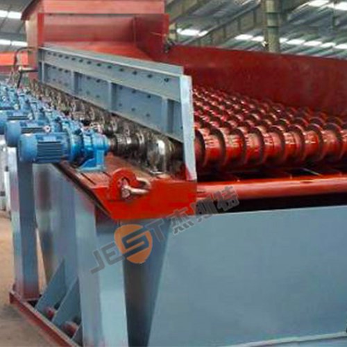 石料从入料口进入筛箱后,由于前5根筛轴和水平成15°大夹角,石料开始在自重和筛片转动的双重作用下 以较快速度向下移动同时进行筛分,此为初步粗筛分阶段。大部分物料经此阶段后被筛分完毕并平铺在整个筛面上;当物料进入后5根筛轴以后,由于筛轴排列近乎水平,筛轴和水平成5°,物料前进速度减慢,此为筛分的精筛阶段,物料经此阶段后小于30mm的粒度已被筛下,大于30mm的物料经出料口被送入碎碎机进行下一步破碎。