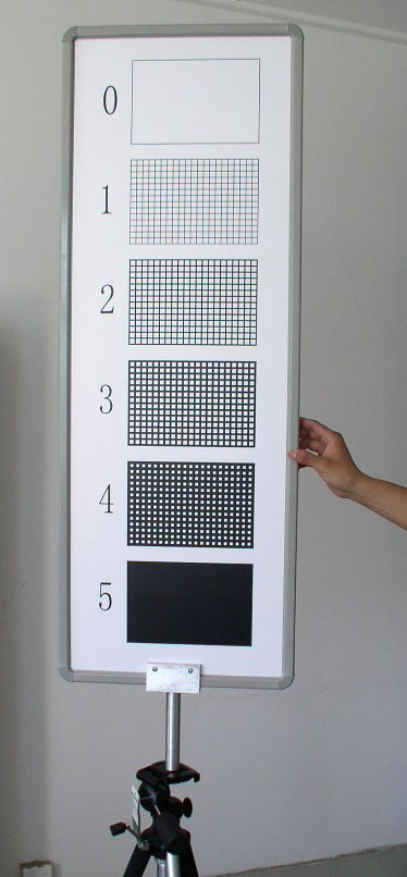 1. 观察前将安装好的林格曼烟气浓度图及其三脚架放置在平稳的地方,并用手扶稳,以免倾倒。使用时图面上不要加任何覆盖层,以免削弱图面的照明。如图面被弄脏或褪色,应立即换掉,以免影响观察的精度。