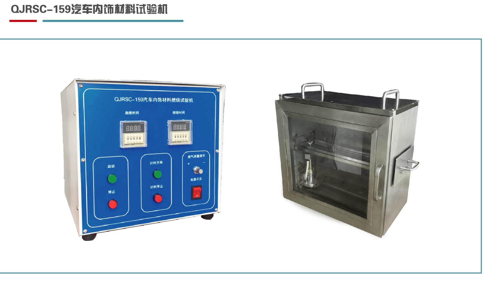 组成部分: 本试验机由控制箱、燃烧箱本体、燃烧灯、电磁阀、高压点火器、温度计、信号控制线及试样上、下支架组成。本机控制箱及燃烧箱均为不锈钢