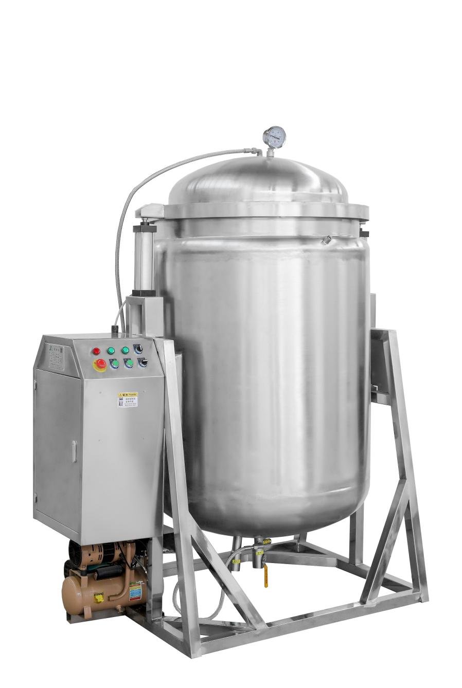 该机设计为带盖的不锈钢蒸煮锅,可以避免蒸煮过程中,锅体对药物的相互腐蚀,有助于延长锅体的使用寿命。锅体夹层为保温材料,使用时安全可靠。启动气缸开盖,电动变速出料装置,操作上时省力简便。
