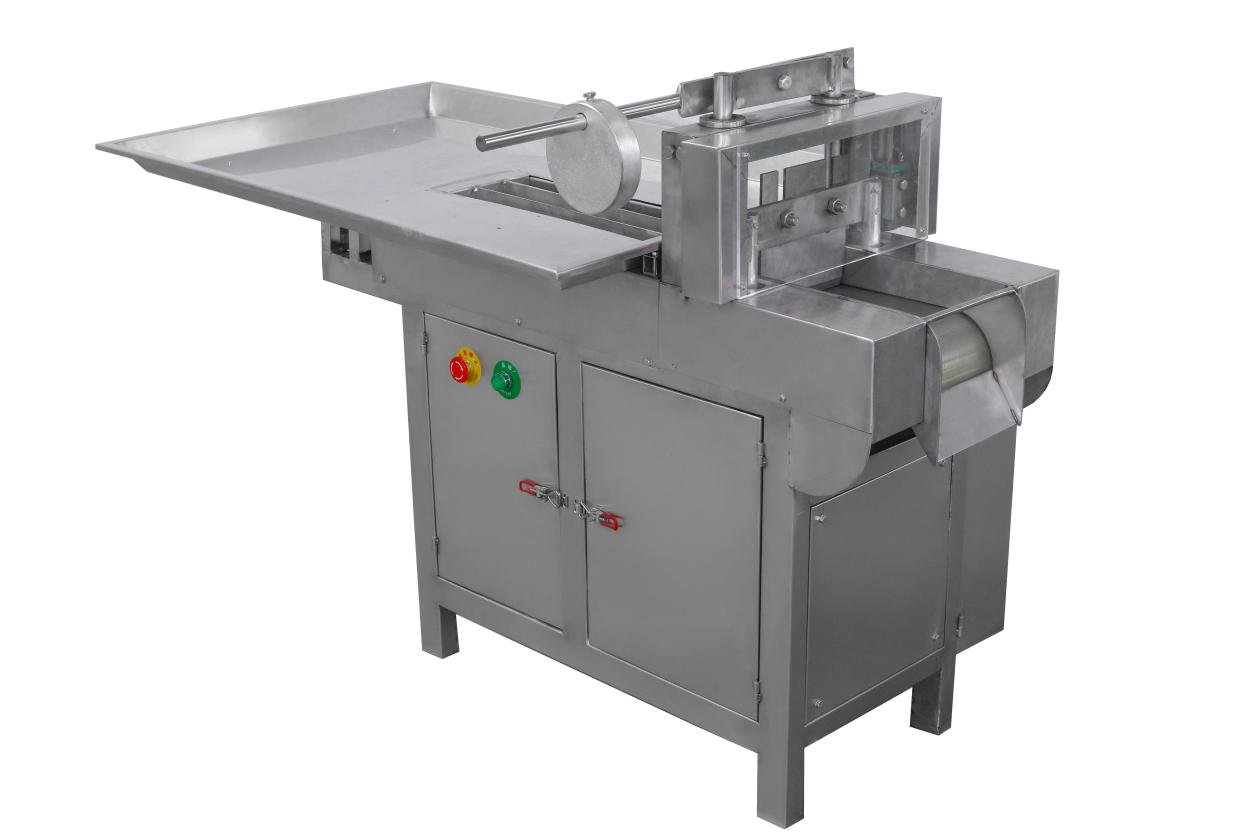 特制的输送带和自适应压料机构将物料按偏心机构设定的距离,作连续均匀地步进移动,直线运动的切刀机构直接在输送带上切断物料,切割厚度通过偏心块(PLC)可调长短/厚薄。
