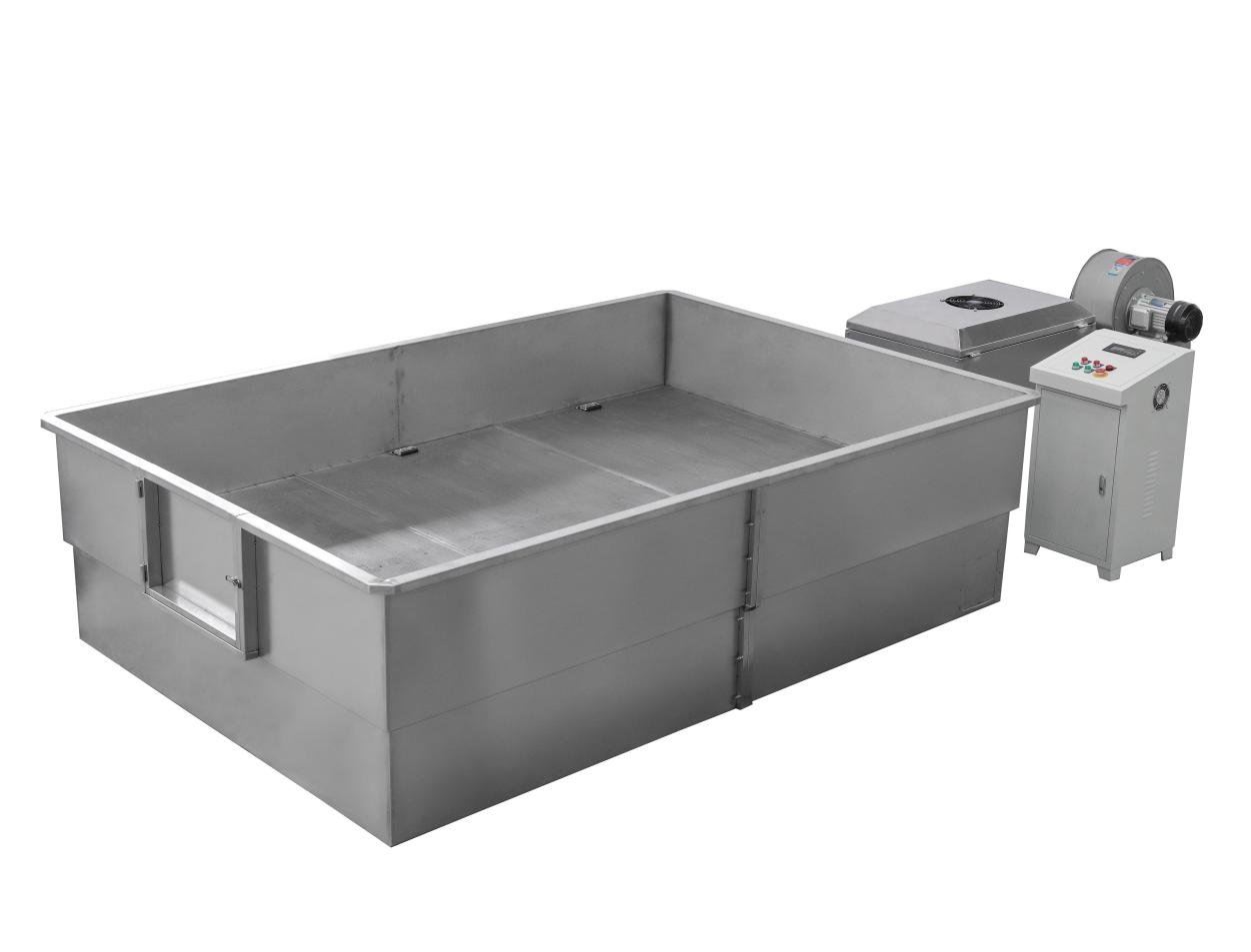 由烘箱、接管、风机、电磁加热管组成。通过电磁加热管加热,产生热量,再通过风机鼓风使热量进入烘箱,使物料干燥。风机、电磁加热管、烘箱之间均采用不锈钢风管连接。