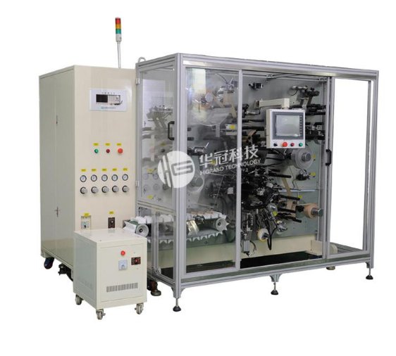 本设备用于超级电容电芯的制作。正、负极片、隔膜、胶带固定在各自放料轴上,经过自动放卷、自动纠偏定位,完成电芯卷绕、贴胶带、整形、下料等动作,并有自动检测功能。
