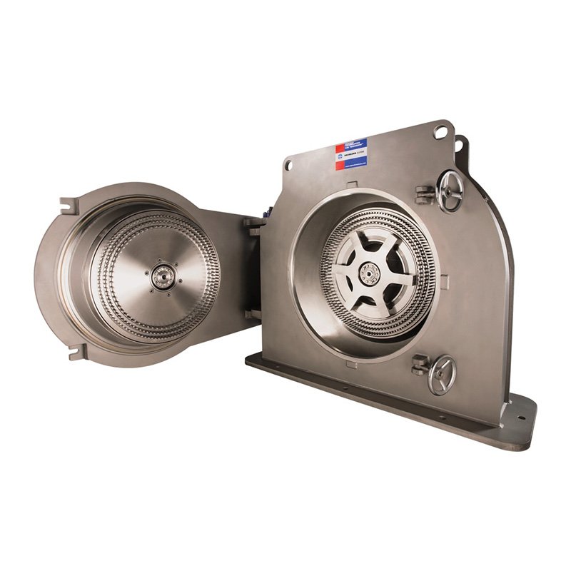 磨内两块针盘以相反的方向高速运转。产品的细度通过调节针盘的转速来实现。该设备清洗非常方便,只需打开磨门即可。物料不宜超过莫氏硬度3。无筛网设计,出料流畅,产能高,运行成本低;可采用双动力,达到200m/s以上的线速度,获得更大粉碎力。