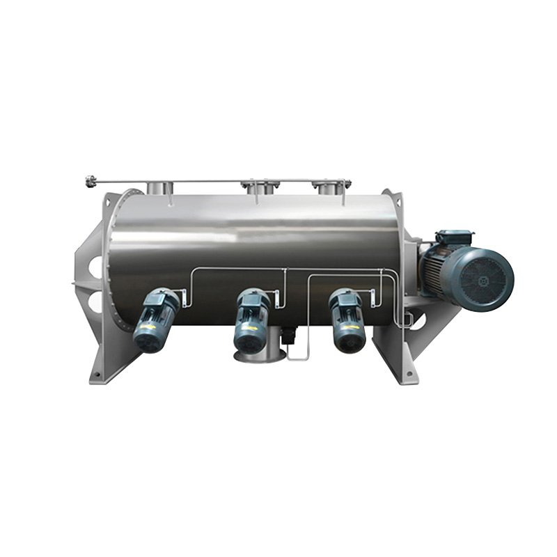 LDH系列犁刀式混合机由圆形筒体、传动机构、犁刀、飞刀四部分组成;工作时,犁刀做圆周运动,物料被犁刀刀面分流成两个方向形成双向物料流,与两侧犁刀分流过来的物料相互交叉形成对流,当物料流经高速飞刀时又被高速飞刀叶片剪切和抛洒,从而在较短时间内达到均匀混合。本机的混合精度高,混合时不产生离析,尤其对于容易团聚的物料,可以起到解聚和打散的作用。