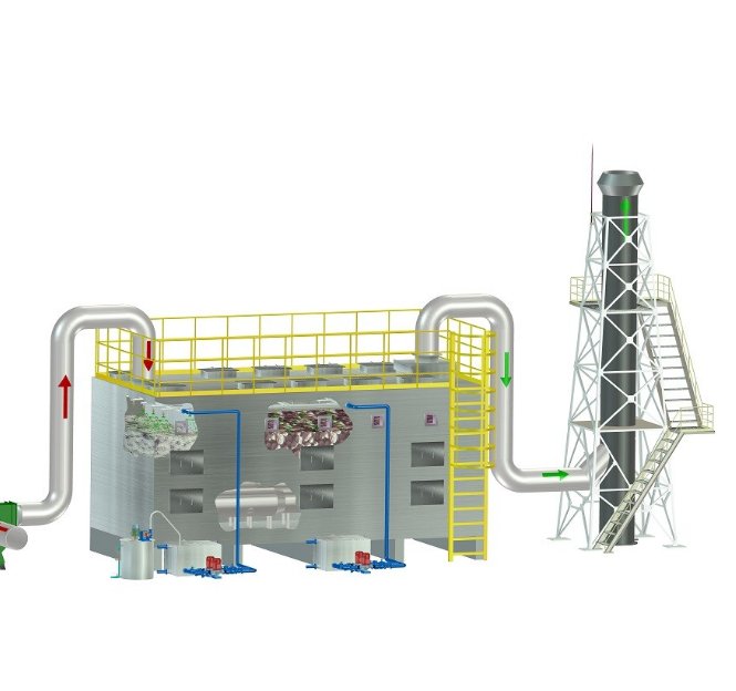生物滤池净化设备是采用生物法,通过培养在生物滤池内生物填料上的微生物膜对收集的臭气进行吸附、吸收、降解。其工艺原理是经过预洗池净化并调节了湿度的空气进入到了生物滤池,在其中生物把致臭污染物降解为无臭的化合物;臭气经预洗池段加湿,在该段内完成了对臭气水的吸收、除尘及加湿的预处理;未清除的恶臭气体再进入生物滤床过滤区,通过过滤层时,污染物从气相中转移到生物膜表面(固相)。此生物膜一方面以废气中的污染物为养料进行生长繁殖;另一方面将污染物中的有害物质分解、降解成无害的CO2、H2O等简单无机物,从而达到除臭的目的,生物过滤器处理后的清洁气体经过风机和排气管道排放到大气中。