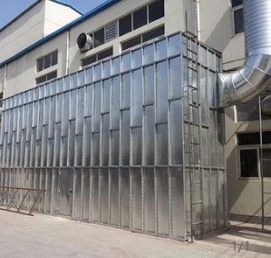 本除尘器主要由灰斗、过滤室、净气室、支架、提升阀、喷吹清灰装置等部分组成。工作时,含尘气体由风道进入灰斗。大颗粒的粉尘直接落入灰斗底部,较小的粉尘随气流转折向上进入过滤室,并被阻留在滤袋外表面,净化了的烟气进入袋内,并经袋口和净气室进入出风倒,由排风口排出。