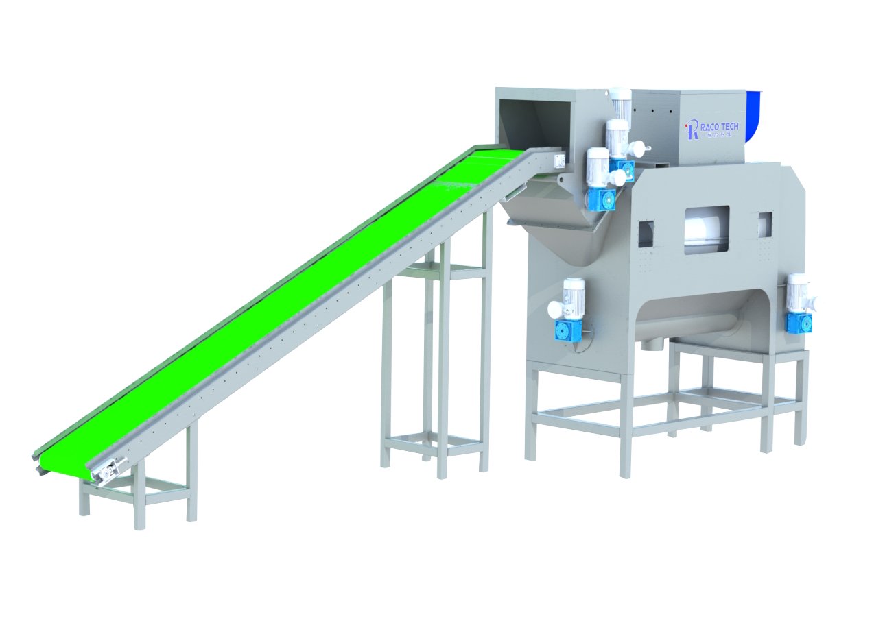 滚筒式全自动拆包机通过皮带机自动给袋,割刀装置进行破袋,滚筒筛实现袋料分离、卸料等步骤,物料靠重力落进贮斗中来完成拆袋卸料工作。废袋通过废袋收集装置,自动完成废袋压缩,废袋收集装袋的工作。作业后中产生的粉尘被携带的除尘装置滤除,使工人能在清洁的坏境中工作,被淸除的袋子碎片进行废袋压碎处理方式机压缩到一个聚乙烯袋中,排出来自动化机器。