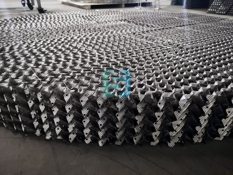 该填料的波纹板片上冲压有许多f5mm左右的小孔,可起到粗分配板片上的液体、加强横向混合的作用、波纹板上轧成细小沟纹,可起到细分配板片上的液体、增强表面润湿性能的作用。金属板波纹填料强度高,耐腐蚀性强。