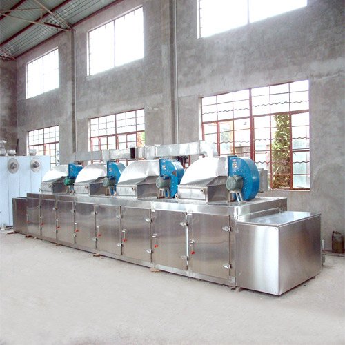 物料由加料器均匀地铺在网带上,网带采用12-120目不锈钢丝网。由传动装置拖动在干燥机内移动。干燥机由若干单元组成,每一单元热风独立循环,部分尾气由伺服排湿风机排出,废气由调节阀控制,热气由下往上或由上往下穿过铺在网带上的物料,加热干燥并带走水分。网带缓慢移动,运行速度可根据物料温度自由调节,干燥后的成品连续落入收料器中。上下循环单元根据用户需要可灵活配备,单元数量可根据需要选取。