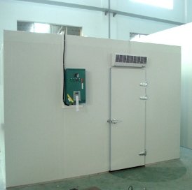 3. 制冷热交换器采用吊顶式结构,不占用冷库实用空间。提高冷库的利用率,热交换器采用轴流风机,强制通风,促使库内空气循环,降温速度快,库温较均匀,冷凝器配有电加热融霜,具有融霜速度快,库温回升较小等优点。