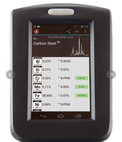 技术规格 重量 1.82kg带电池 尺寸 21*30*12(cm) 激发源 5-6 mj/脉冲,50赫兹重复频率,1064 nm激光源 光谱/范围 多CCD光谱仪:190 nm - 950 nm。 可用的应用程序 Alloy Mode / Empirical mode/ Profile Builder/ Element Pro Mode 光谱数据采集 在无门或门禁操作中收集的频谱数据,用户可设置的门控延迟 操作/氩气净化 在氩净化环境中操作的用户可更换的氩气瓶。氩罐在更换前提供大约600个测试。 分析范围 全元素分析 激光光栅 将激光对准需检测位置进行定向分析。光栅图形16 x 16网格,256个位置。 电子信号处理 ARM Cortex-A9双核/1.2 GHz内存:1 GB DDR2内存,1 GB内存 自动对焦 计算机控制手动或自动调整激光聚焦样本位置 供电 可充电锂电池,交流电源。 显示 5"彩色触摸屏智能手机显示屏-PowerVR SGX540 3D图形 数据存储 8 GB SD 通讯-数据传输 Wifi,蓝牙,USB。能连接到大多数设备,包括SciAps ProfileBuilder PC软件。 样品查看 在分析过程中,通过机载摄像机录制样本测试的视频或图片 校准检查 通过测试材料为316不锈钢的内部快门,完成自动校准和波长刻度验证 漂移修正 只有对精度要求比较高的测试需要运行漂移修正功能 。通过测试工厂提供的标件自动完成漂移校正 合**号库 包含500多个合**号。用户可以 运行ProfileBuilder软件自行添加合**号。 安全 密码保护 标准配件 防水外壳,2锂离子电池,充电器,USB线,标准用于导入的ProfileBuilder软件,编辑合金级库(合金应用),查看,保存结果,数据显示。腕带,工厂启动培训支持,终身免费软件