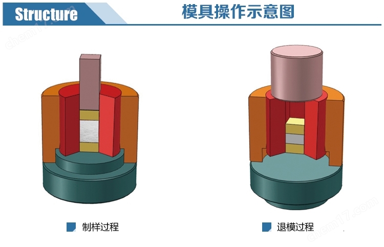 新诺仪器专注于粉末解决方法首先准备一个大于卡住模具直径的耐压的中空工具,将卡住的模具倒置过来放在准备好的耐压工具【退模工具】上,以便被卡模具的压杆能放进去,将组合好的模具及退模工具放在压片机内,然后在