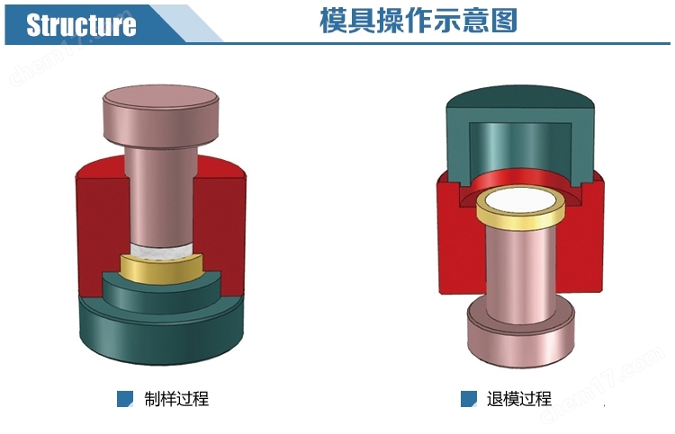 新诺仪器专注于粉末解决方法首先准备一个大于卡住模具直径的耐压的中空工具,将卡住的模具倒置过来放在准备好的耐压工具【退模工具】上,以便被卡模具的压杆能放进去,将组合好的模具及退模工具放在压片机内,然后在