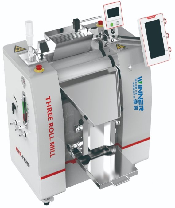 三辊机能够处理高达数百万Cps粘度的浆料类产品,分散效果**,可将较宽分布的物料处理为窄而尖的分布。