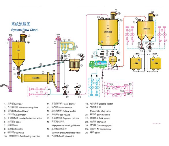 来自破碎机破碎后的石灰石颗粒经提升机提升至原料仓,经下方的给料机定量的将石灰石颗粒加入到石灰石球磨机内,给料量即可通过变频器变频调速,也可以通过螺旋称给料机进一步实现给料量的调节。经球磨机粉碎后的物料一部分细的粉尘直接进入除尘器进行收集,一部分经提升机