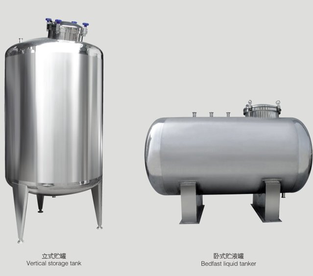 本厂生产的 贮罐,设计合理、工艺先进、自动控制,符合GMP认证要求。罐体采用立式或卧式单层或双层结构,并根据用户要求充填保温材料。内胆抛光至Ra0.45um,外部采用镜面板或磨砂板保温。顶部开设进水口、回流口 、消毒口、清洗口、人孔并安装0.45 um空气呼吸器。