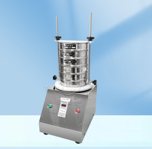 检验筛是以YZU立式振动电机作为整机振动源,通过振动电机带动上部振动盘振动,再通过振动盘传导至安放在振动盘上部圆形筛框,然后由需要检测目数的筛框把小于筛网孔径的物料颗粒筛分至下层筛框,如此层层筛选,使每层检验筛内只留相同粒度的物料而达到不同粒度的分离,使筛框中的物料能非常有效的起到分级筛分目的。