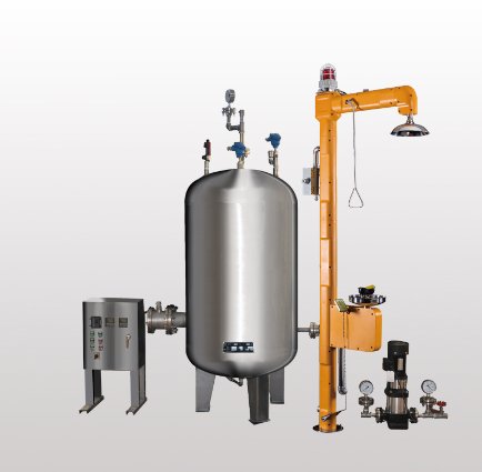 温水循环洗眼站适用于同时使用多台洗眼器,保证出水温度在15.7-37.8度之间 ,该系统采用大型储水箱,提供71加仑/分钟的供水量,可为单台或多台洗眼器提供水源,保证用水时间大于15分钟 。