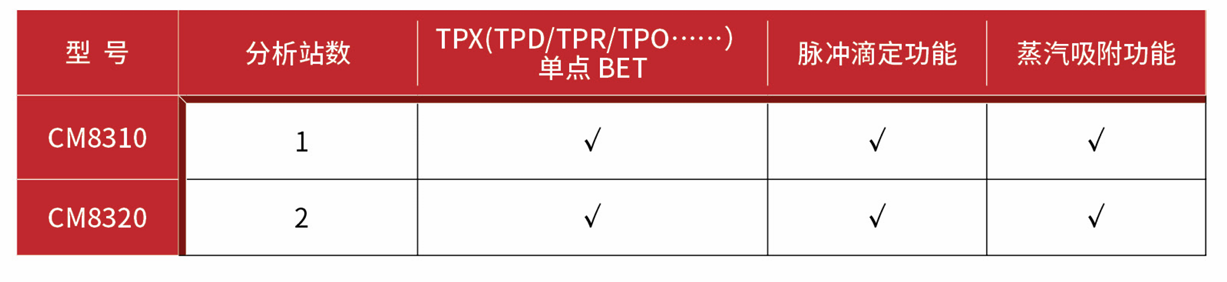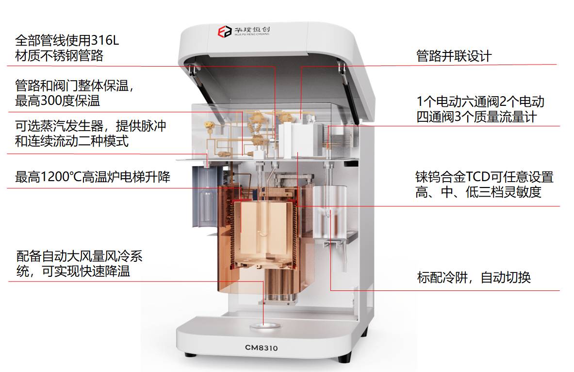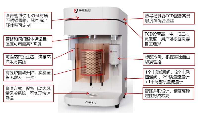 ChemiMaster 8310(CM8310)仪器基于动态技术,可进行TPD(程序升温脱附)、TPR(程序升温还原),TPO(程序升温氧化)、脉冲化学吸附测金属分散度、蒸汽吸附、BET单点比表面积的物理吸附分析、多组分竞争性吸附,用于测定催化剂材料的酸碱量、酸碱强度、贵金属分散度、氧化还原性能、多组分竞争性吸附等重要指标。