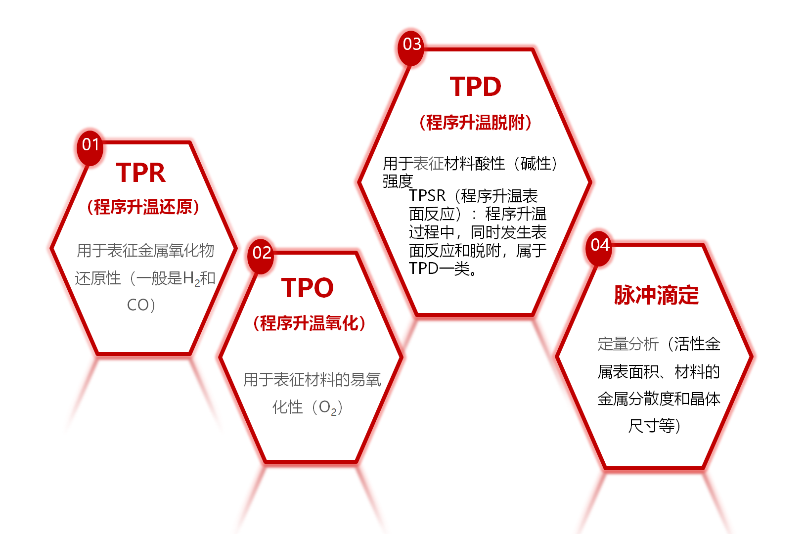 TPR用于表征金属催化剂的还原性。用一定比例的H2/Ar混合气体作为载气流过样品床层并按照一定速率程序升温。记录样品温度与载气浓度的变化,即为TPR测试谱图。谱图中还原峰的温度对应金属中心的还原性能,谱图中还原峰的面积对应金属中心还原过程的耗氢量。TPO与TPR类似,用氧化性气体代替还原性气体,用于测试金属中心的氧化性能。