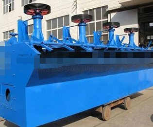 棒型浮选机主要是利用叶轮或棒型轮回转所产生的负压,将空气从中空轴吸入,然后浮选轮将其分割形成微小气泡,再由叶轮或棒型轮强烈的搅拌与抛射,使得矿浆与空气充分的混合,这种浆气混合物在浮选轮的斜棒作用下,经捕收剂作用的有用矿物颗粒,选择性地附着于气泡上,上浮至矿浆面,由刮板刮入精矿槽内,从而完成分选作业。